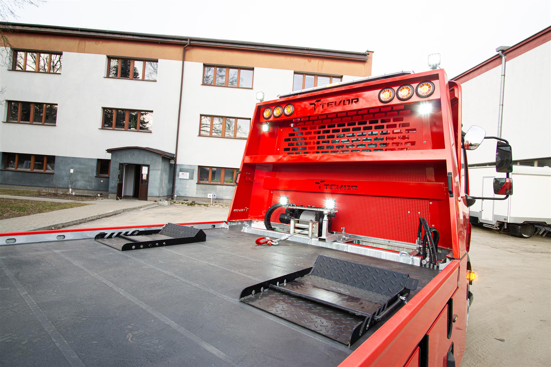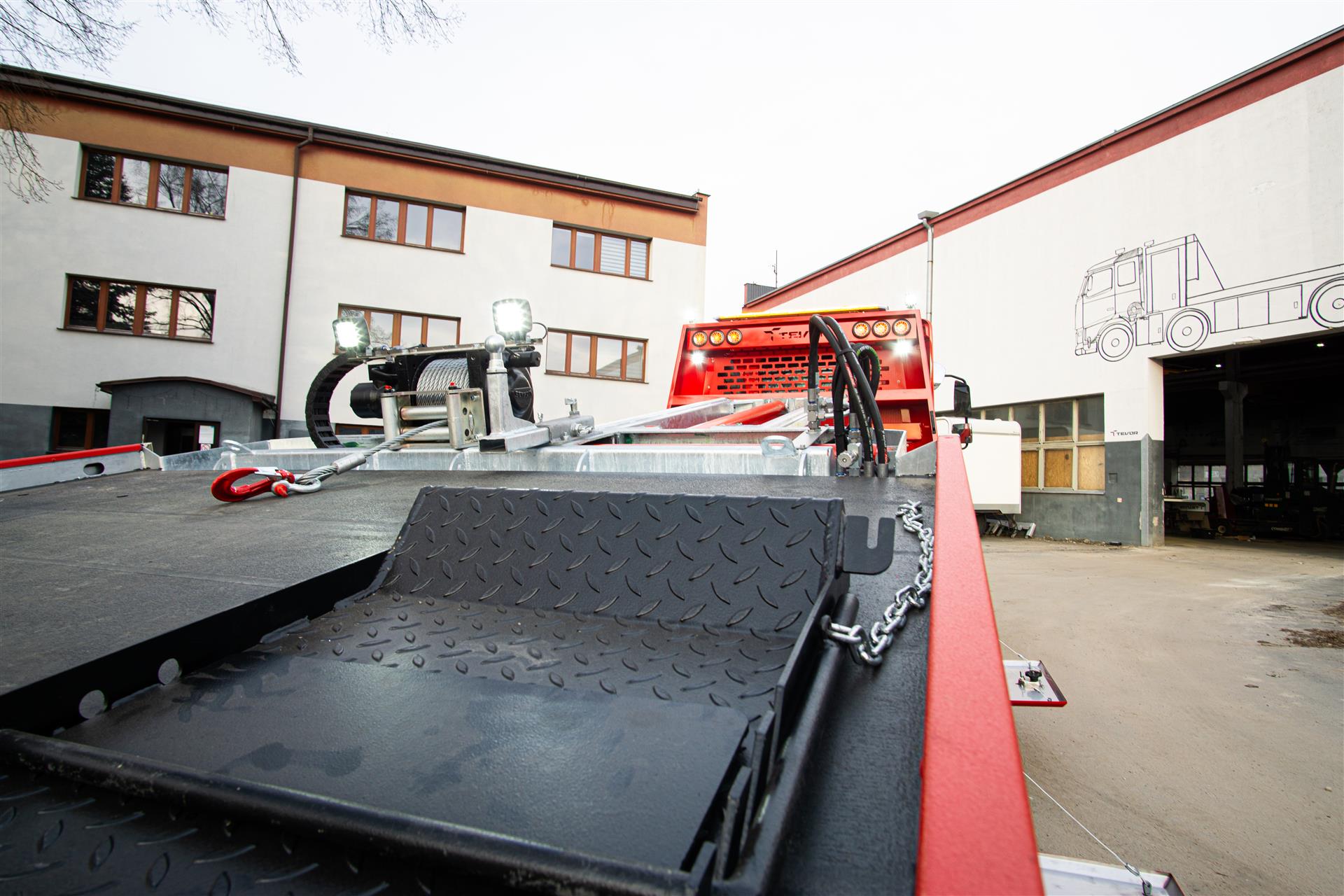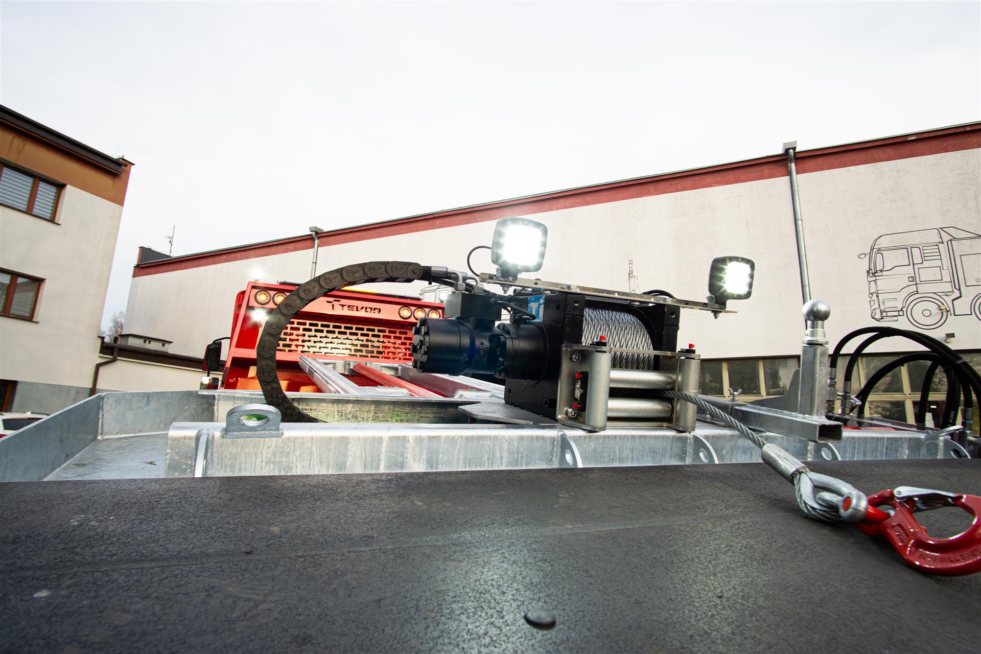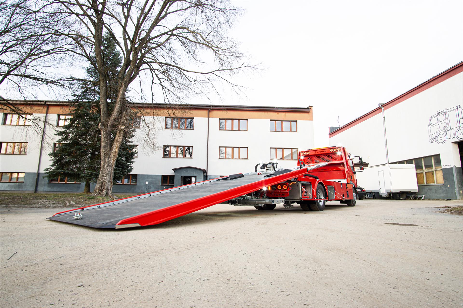 Platforma uchylana i zsuwana tylną krawędzią do podłoża za pomocą siłowników hydraulicznych. Platforma o konstrukcji panelowej wykonana z poprzecznie ułożonych specjalnych profili stalowych o wysokiej jakości i wytrzymałości. Kształt platformy zapobiega przedostawaniu się płynów eksploatacyjnych z holowanych pojazdów do gruntu. Posiada znak CE (zgodny z normami Unii Europejskiej).